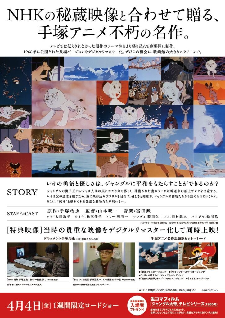 一世を風靡した手塚治虫原作テレビアニメ「ジャングル大帝」放送から60周年にあたる今年、その最初の劇場版アニメとなった『ジャングル大帝』劇場版(1966)を最新技術でデジタルリマスターし上映します。