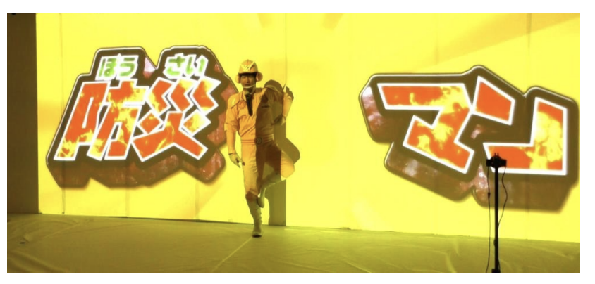 防災マンに扮するのはデジタル芸⼈のパイオニア「アキラボーイ」さん。ヒーローショーのように参加者を巻き込み、盛り上げて、みんなを導いていきます。