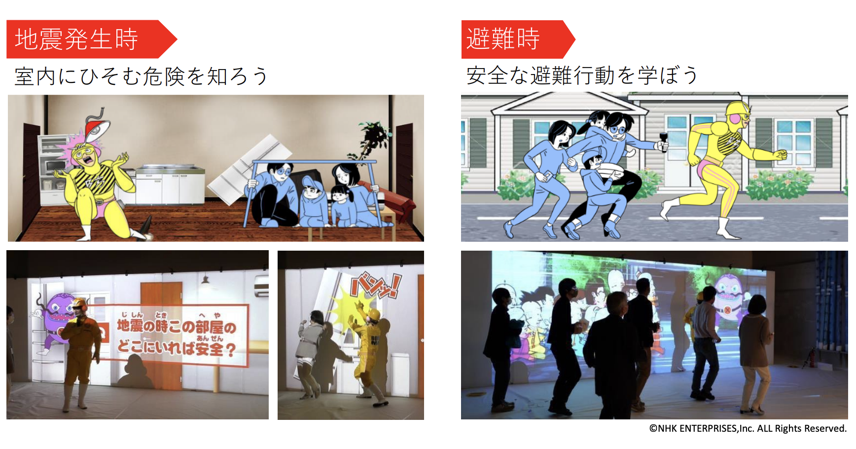 各ステージで災害モンスターからのミッションにチャレンジしていただきます。参加者はスクリーンに投影された映像の前で、地震発⽣後に⾝を隠す場所を探したり、初期消⽕を⾏ったり、バーチャルならではの安全でインタラクティブな体験ができます。そのほか防災クイズにも答えていただきます。